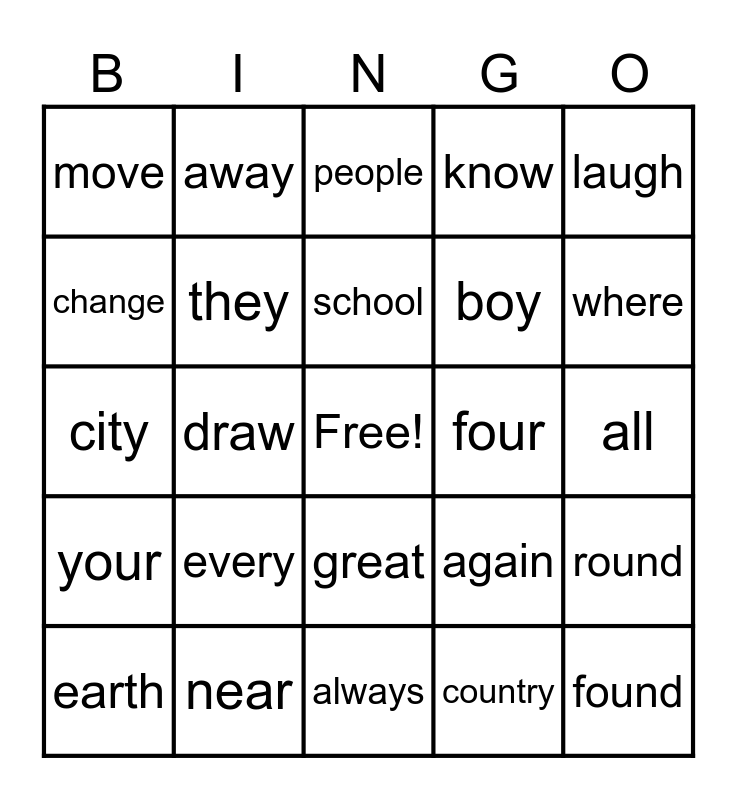 This bingo card has a free space and 24 words: every, near, school, earth, laugh, move, change, away, four, great, boy, city, again, round, they, country, all, people, where, draw, found, your, know and always.
