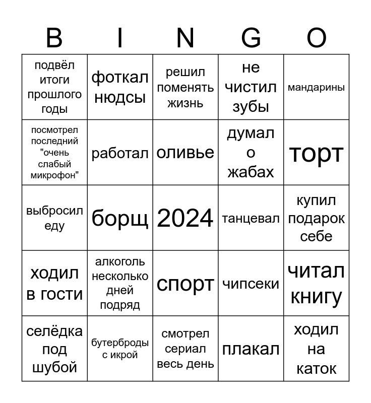 This bingo card has a free space and 24 words: алкоголь несколько дней подряд, бутерброды с икрой, оливье, селëдка под шубой, мандарины, подвëл итоги прошлого годы, посмотрел последний "очень слабый микрофон", фоткал нюдсы, танцевал, спорт, думал о жабах, выбросил еду, чипсеки, читал книгу, работал, плакал, купил подарок себе, решил поменять жизнь, торт, борщ, ходил на каток, ходил в гости, не чистил зубы and смотрел сериал весь день.