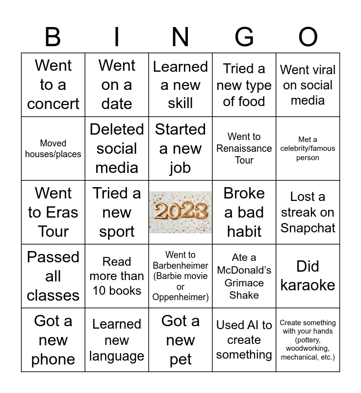 This bingo card has a free space and 25 words: Read more than 10 books, Got a new pet, Started a new job, Got a new phone, Went viral on social media, Went to a concert, Moved houses/places, Went on a date, Broke a bad habit, Went to Barbenheimer (Barbie movie or Oppenheimer), Went to Renaissance Tour, Went to Eras Tour, Ate a McDonald’s Grimace Shake, Did karaoke, Deleted social media, Had a new family member added, Lost a streak on Snapchat, Learned a new skill, Met a celebrity/famous person, Tried a new sport, Create something with your hands (pottery, woodworking, mechanical, etc.), Learned new language, Passed all classes, Tried a new type of food and Used AI to create something.