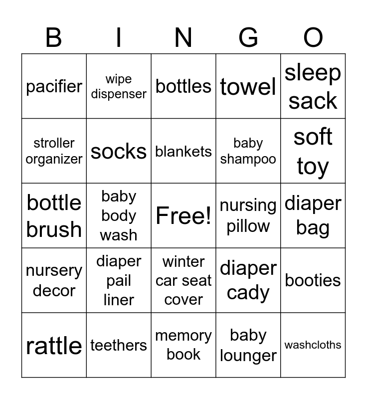 This bingo card has a free space and 38 words: diapers, onsies, sleepers, socks, booties, diaper pail liner, blankets, swaddle blankets, sleep sack, baby shampoo, baby body wash, towel, washcloths, diaper bag, stroller organizer, nursery decor, baby book, bottles, bottle warmer, nursing pillow, pacifier, teethers, soft toy, rattle, changing pad cover, memory book, mobile, postpartum care item, nail clippers/files, hairbrush, parenting book, winter car seat cover, baby lounger, wipe dispenser, crib sheets, diaper cady, bottle brush and snack cup.