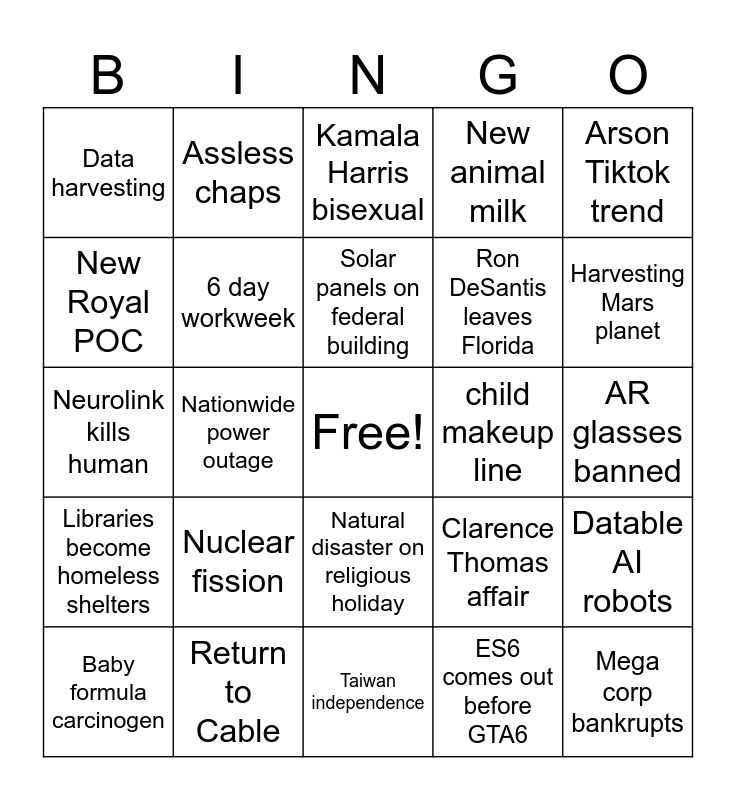This bingo card has a free space and 24 words: Nuclear fission, Return to Cable, Solar panels on federal building, Baby formula carcinogen, Arson Tiktok trend, Data harvesting, New Royal POC, Assless chaps, child makeup line, Natural disaster on religious holiday, Ron DeSantis leaves Florida, Neurolink kills human, Clarence Thomas affair, Datable AI robots, 6 day workweek, ES6 comes out before GTA6, AR glasses banned, Kamala Harris bisexual, Harvesting Mars planet, Nationwide power outage, Mega corp bankrupts, Libraries become homeless shelters, New animal milk and Taiwan independence.