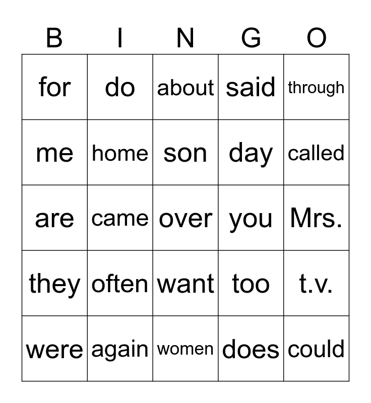 This bingo card has a free space and 25 words: often, women, son, were, through, for, me, do, you, want, day, are, too, t.v., home, new, Mrs., about, called, came, could, again, they, said and does.