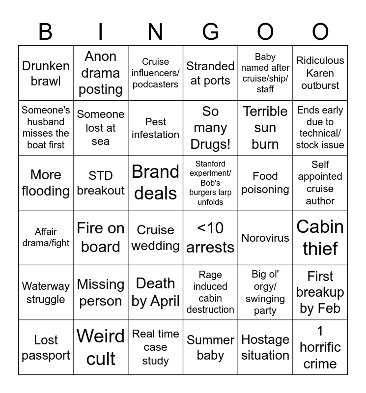This bingo card has 36 words: Rage induced cabin destruction, Death by April, Summer baby, Someone's husband misses the boat first, Affair drama/fight, Stanford experiment/ Bob's burgers larp unfolds, Someone lost at sea, Real time case study, Baby named after cruise/ship/ staff, Big ol' orgy/ swinging party, Ends early due to technical/ stock issue, Stranded at ports, First breakup by Feb, STD breakout, So many Drugs!, Drunken brawl, Waterway struggle, Food poisoning, More flooding, Cruise influencers/ podcasters, Brand deals, Fire on board, <10 arrests, Cruise wedding, Norovirus, Anon drama posting, Terrible sun burn, Weird cult, Pest infestation, Ridiculous Karen outburst, 1 horrific crime, Lost passport, Cabin thief, Self appointed cruise author, Missing person and Hostage situation.