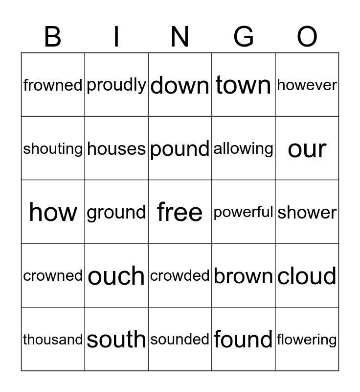 This bingo card has a free space and 24 words: ouch, south, pound, thousand, however, frowned, shouting, proudly, powerful, crowded, allowing, how, brown, cloud, houses, found, shower, down, our, ground, flowering, crowned, town and sounded.