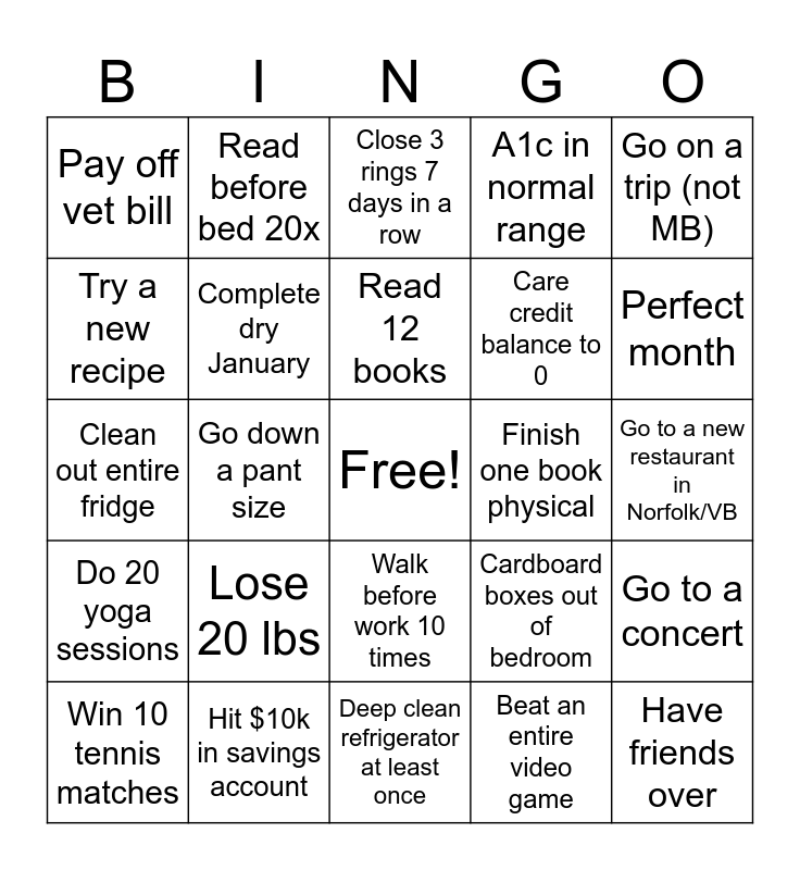 This bingo card has a free space and 24 words: Lose 20 lbs, Hit $10k in savings account, Read 12 books, Win 10 tennis matches, Go on a trip (not MB), Pay off vet bill, Try a new recipe, Read before bed 20x, Finish one book physical, Walk before work 10 times, Care credit balance to 0, Clean out entire fridge, Cardboard boxes out of bedroom, Go to a concert, Complete dry January, Beat an entire video game, Go to a new restaurant in Norfolk/VB, Close 3 rings 7 days in a row, Perfect month, Go down a pant size, Have friends over, Do 20 yoga sessions, A1c in normal range and Deep clean refrigerator at least once.