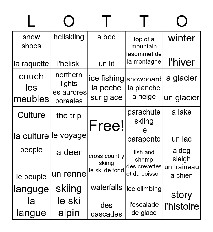 This bingo card has a free space and 24 words: a deer un renne, skiing le ski alpin, ice fishing la peche sur glace, languge la langue, winter l'hiver, snow shoes la raquette, couch les meubles, heliskiing l'heliski, parachute skiing le parapente, cross country skiing le ski de fond, snowboard la planche a neige, Culture la culture, fish and shrimp des crevettes et du poisson, a dog sleigh un traineau a chien, northern lights les aurores boreales, ice climbing l'escalade de glace, a lake un lac, a bed un lit, a glacier un glacier, the trip le voyage, story l'histoire, people le peuple, top of a mountain lesommet de la montagne and waterfalls des cascades.