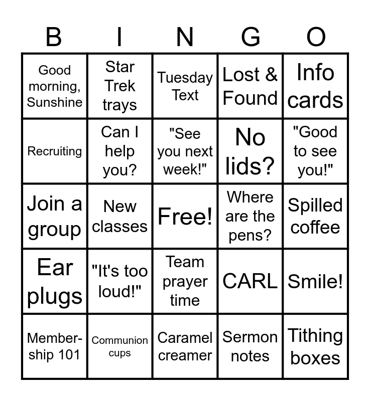 This bingo card has a free space and 29 words: Member-ship 101, Welcome!, New classes, Tangled nametags, Good morning, Sunshine, Tuesday Text, Can I help you?, "It's too loud!", Where are the pens?, Communion cups, Spilled coffee, Tithing boxes, Caramel creamer, Sermon notes, "Good to see you!", It's cold at the door!, Team prayer time, Ear plugs, Info cards, Join a group, CARL, Stir sticks, No lids?, Recruiting, Lost & Found, Star Trek trays, Smile!, "See you next week!" and "Have a great day!".