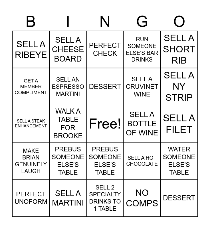 This bingo card has a free space and 24 words: PREBUS SOMEONE ELSE'S TABLE, SELL A MARTINI, DESSERT, PERFECT UNOFORM, SELL A SHORT RIB, SELL A RIBEYE, GET A MEMBER COMPLIMENT, SELL A CHEESE BOARD, SELL A BOTTLE OF WINE, PREBUS SOMEONE ELSE'S TABLE, SELL A CRUVINET WINE, SELL A STEAK ENHANCEMENT, SELL A HOT CHOCOLATE, WATER SOMEONE ELSE'S TABLE, SELL AN ESPRESSO MARTINI, NO COMPS, SELL A FILET, PERFECT CHECK, SELL A NY STRIP, WALK A TABLE FOR BROOKE, DESSERT, MAKE BRIAN GENUINELY LAUGH, RUN SOMEONE ELSE'S BAR DRINKS and SELL 2 SPECIALTY DRINKS TO 1 TABLE.