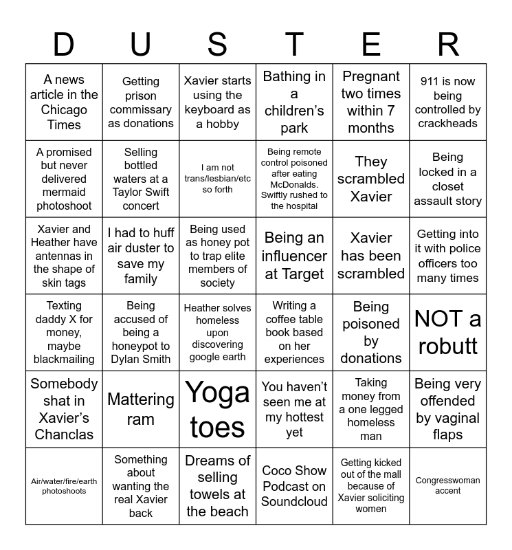 This bingo card has 36 words: You haven’t seen me at my hottest yet, Yoga toes, Coco Show Podcast on Soundcloud, A promised but never delivered mermaid photoshoot, Texting daddy X for money, maybe blackmailing, Being an influencer at Target, Selling bottled waters at a Taylor Swift concert, Dreams of selling towels at the beach, Pregnant two times within 7 months, Taking money from a one legged homeless man, Being locked in a closet assault story, Bathing in a children’s park, Being very offended by vaginal flaps, I had to huff air duster to save my family, Being remote control poisoned after eating McDonalds. Swiftly rushed to the hospital, A news article in the Chicago Times, Somebody shat in Xavier’s Chanclas, Xavier has been scrambled, Xavier and Heather have antennas in the shape of skin tags, Xavier starts using the keyboard as a hobby, Being used as honey pot to trap elite members of society, Being accused of being a honeypot to Dylan Smith, Writing a coffee table book based on her experiences, Heather solves homeless upon discovering google earth, Being poisoned by donations, Getting prison commissary as donations, They scrambled Xavier, Something about wanting the real Xavier back, I am not trans/lesbian/etc so forth, 911 is now being controlled by crackheads, Congresswoman accent, Air/water/fire/earth photoshoots, NOT a robutt, Getting into it with police officers too many times, Mattering ram and Getting kicked out of the mall because of Xavier soliciting women.