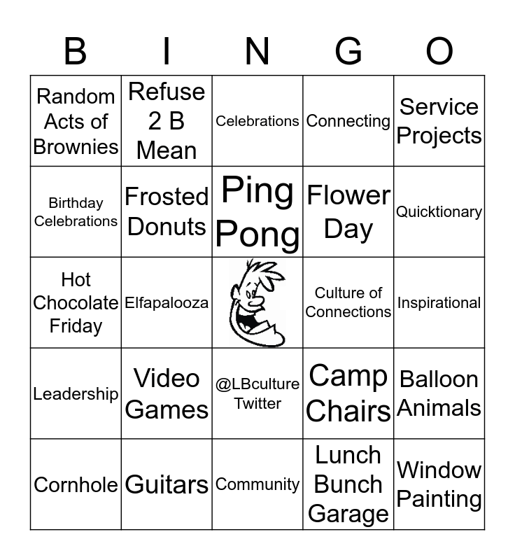 This bingo card has a free space and 24 words: Video Games, Guitars, Ping Pong, Cornhole, Service Projects, Random Acts of Brownies, Birthday Celebrations, Refuse 2 B Mean, Culture of Connections, @LBculture Twitter, Flower Day, Hot Chocolate Friday, Camp Chairs, Balloon Animals, Frosted Donuts, Lunch Bunch Garage, Inspirational, Celebrations, Quicktionary, Elfapalooza, Window Painting, Leadership, Connecting and Community.