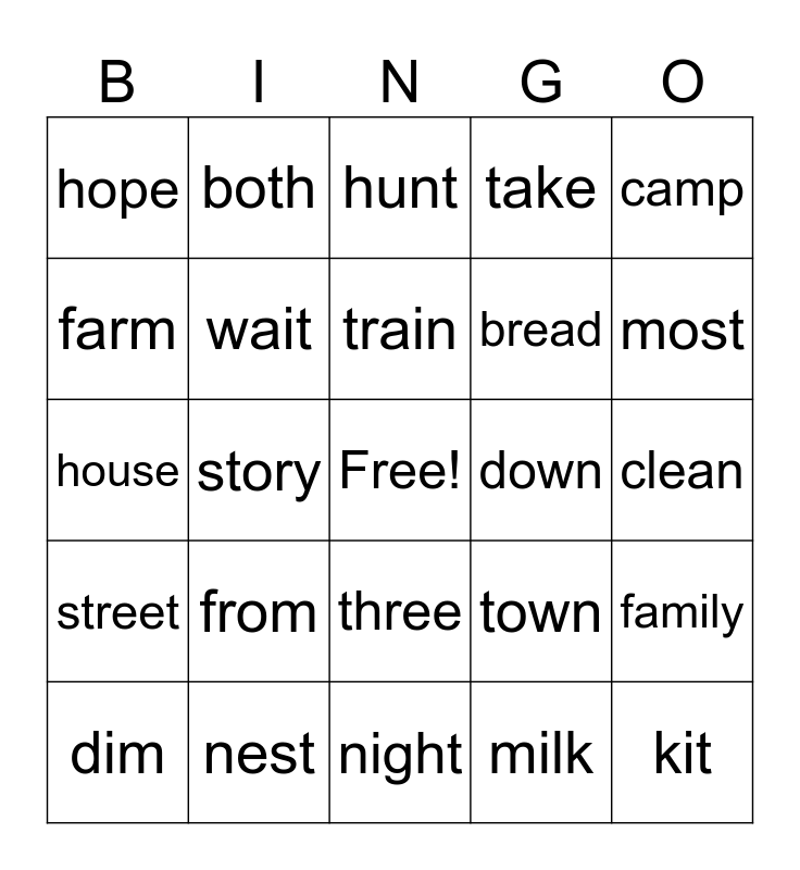 This bingo card has a free space and 44 words: sag, kit, gag, dim, bet, milk, hunt, band, camp, nest, take, down, three, from, boy, night, please, house, book, most, both, money, bridge, hope, green, clean, funny, same, town, street, table, family, father, front, story, life, land, bird, train, farm, bread, ship, wait and bank.