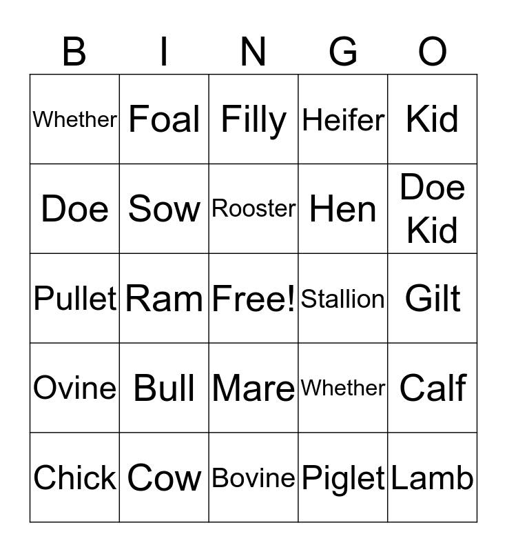 This bingo card has a free space and 24 words: Bull, Cow, Rooster, Chick, Kid, Whether, Doe, Foal, Stallion, Mare, Hen, Pullet, Whether, Calf, Sow, Piglet, Gilt, Filly, Doe Kid, Ram, Lamb, Ovine, Heifer and Bovine.