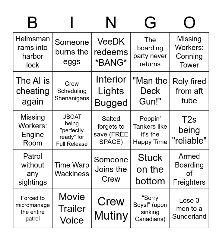 This bingo card has a free space and 24 words: Time Warp Wackiness, Movie Trailer Voice, Interior Lights Bugged, Forced to micromanage the entire patrol, Missing Workers: Conning Tower, Helmsman rams into harbor lock, The AI is cheating again, Someone burns the eggs, Poppin' Tankers like it's the Happy Time, Someone Joins the Crew, "Man the Deck Gun!", Missing Workers: Engine Room, Stuck on the bottom, Armed Boarding of Freighters, Crew Scheduling Shenanigans, "Sorry Boys!" (upon sinking Canadians), T2s being "reliable", VeeDK redeems *BANG*, Roly fired from aft tube, UBOAT being "perfectly ready" for Full Release, Lose 3 men to a Sunderland, Patrol without any sightings, The boarding party never returns and Crew Mutiny.