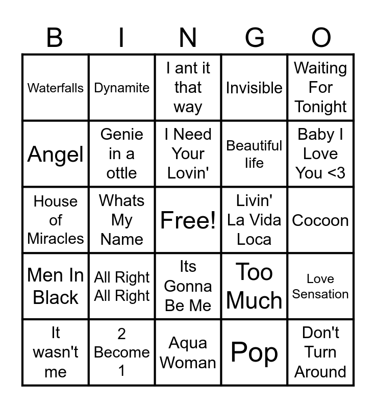 This bingo card has a free space and 82 words: Wannabe, ...Baby one more time, I ant it that way, No Scrubs, U Cant touch this, Bye Bye Bye, Don't Speak, The Sign, Gettin' Jiggy With it, MMMBop, Everybody, All Star, Genie in a ottle, Livin' La Vida Loca, Torn, Waterfalls, It wasn't me, Angel, Boombastic, Turn Back Time, Tubthumping, Beautiful Iife, Don't Turn Around, Waiting For Tonight, Whats My Name, Save Tonight, Semi-Charmed Life, My Favorite Simulation, Bad To the Bone, Fifteen Again, All Right All Right, Back Again, House of Miracles, Ne me Quiite Pas, I Still Miss my Mom, Aqua Woman, Swoon, Be My Submissive, Baby I Love You <3, Let The Children Play, Christmas In July, Invisible, Nihilistic Baby, What is Love, See Me, Dynamite, Wheel, I Need Your Lovin', Christmas Without U, Glassy Mobs, More Than You, Cocoon, 2 Become 1, Live Life, Stop, Say You'll Be There, Spice up Your Life, Who Do you Think You Are, Viva Forever, Too Much, Mama, Wild Wild West, Men In Black, Just The Two Of Us, As Long as You Love me, Shape of My Heart, The Story, Incomplete, Drowning, Larger Than Life, Tearin' Up My Heart, I Promise You, Its Gonna Be Me, Pop, Good, One of us, Every Time, Guilty, Shakespeare in Love, Back At One, Love Sensation and Stay (I missed You).