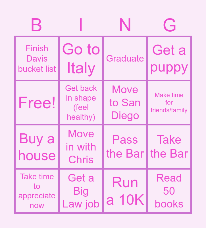 This bingo card has 16 words: Get a Big Law job, Take the Bar, Graduate, Finish Davis bucket list, Buy a house, Go to Italy, Pass the Bar, Run a 10K, Free!, Get back in shape (feel healthy), Take time to appreciate now, Get a puppy, Move in with Chris, Make time for friends/family, Move to San Diego and Read 50 books.