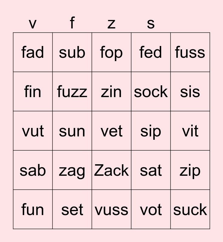 This bingo card has a free space and 24 words: zag, set, zin, fun, fuss, fad, fin, sub, sip, Zack, sock, vut, sat, zip, fuzz, vot, vit, fop, sis, sun, suck, sab, fed and vuss.
