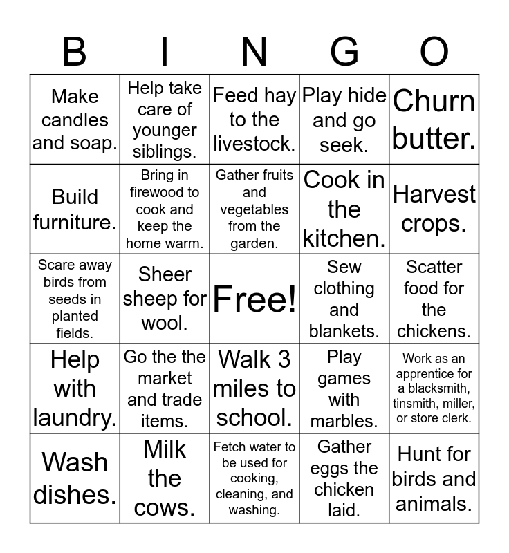 This bingo card has a free space and 24 words: Go the the market and trade items., Milk the cows., Gather fruits and vegetables from the garden., Wash dishes., Churn butter., Make candles and soap., Build furniture., Help take care of younger siblings., Sew clothing and blankets., Walk 3 miles to school., Cook in the kitchen., Scare away birds from seeds in planted fields., Play games with marbles., Work as an apprentice for a blacksmith, tinsmith, miller, or store clerk., Bring in firewood to cook and keep the home warm., Gather eggs the chicken laid., Scatter food for the chickens., Feed hay to the livestock., Harvest crops., Sheer sheep for wool., Hunt for birds and animals., Help with laundry., Play hide and go seek. and Fetch water to be used for cooking, cleaning, and washing..