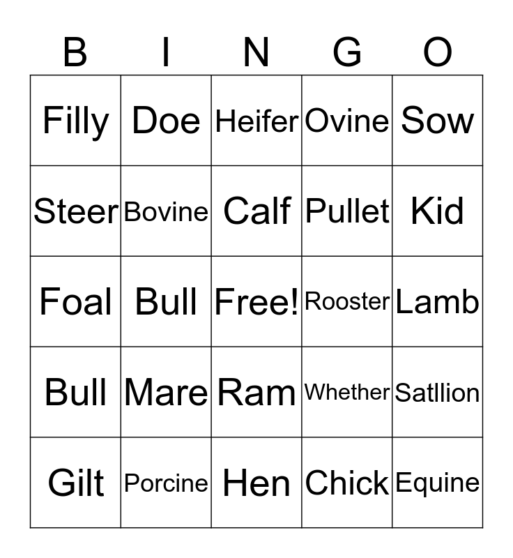 This bingo card has a free space and 24 words: Mare, Porcine, Calf, Gilt, Sow, Filly, Steer, Doe, Rooster, Ram, Pullet, Foal, Whether, Satllion, Bovine, Chick, Lamb, Heifer, Kid, Bull, Equine, Bull, Ovine and Hen.