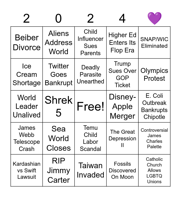 This bingo card has a free space and 24 words: Sea World Closes, RIP Jimmy Carter, Deadly Parasite Unearthed, Kardashian vs Swift Lawsuit, SNAP/WIC Eliminated, Beiber Divorce, Ice Cream Shortage, Aliens Address World, Disney-Apple Merger, Temu Child Labor Scandal, Trump Sues Over GOP Ticket, World Leader Unalived, The Great Depression II, Controversial James Charles Palette, Twitter Goes Bankrupt, Fossils Discovered On Moon, E. Coli Outbreak Bankrupts Chipotle, Child Influencer Sues Parents, Olympics Protest, Shrek 5, Catholic Church Allows LGBTQ Unions, James Webb Telescope Crash, Higher Ed Enters Its Flop Era and Taiwan Invaded.