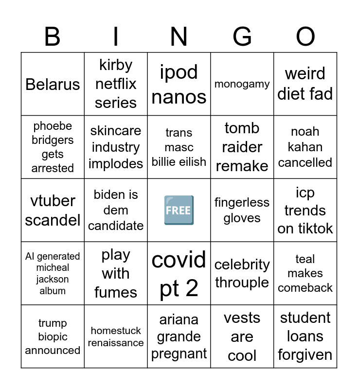 This bingo card has a free space and 24 words: play with fumes, homestuck renaissance, trans masc billie eilish, trump biopic announced, weird diet fad, Belarus, phoebe bridgers gets arrested, kirby netflix series, fingerless gloves, covid pt 2, tomb raider remake, vtuber scandel, celebrity throuple, teal makes comeback, skincare industry implodes, vests are cool, icp trends on tiktok, ipod nanos, noah kahan cancelled, biden is dem candidate, student loans forgiven, AI generated micheal jackson album, monogamy and ariana grande pregnant.