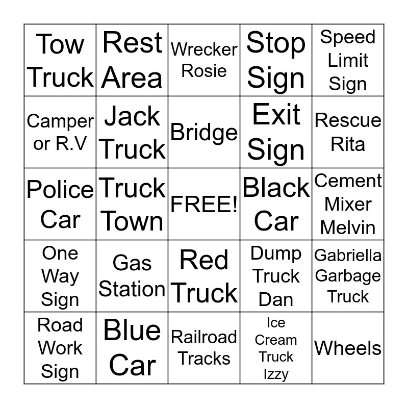 This bingo card has a free space and 24 words: Gas Station, Blue Car, Bridge, Road Work Sign, Speed Limit Sign, Tow Truck, Camper or R.V, Rest Area, Black Car, Red Truck, Exit Sign, Police Car, Dump Truck Dan, Gabriella Garbage Truck, Jack Truck, Ice Cream Truck Izzy, Cement Mixer Melvin, Wrecker Rosie, Rescue Rita, Truck Town, Wheels, One Way Sign, Stop Sign and Railroad Tracks.