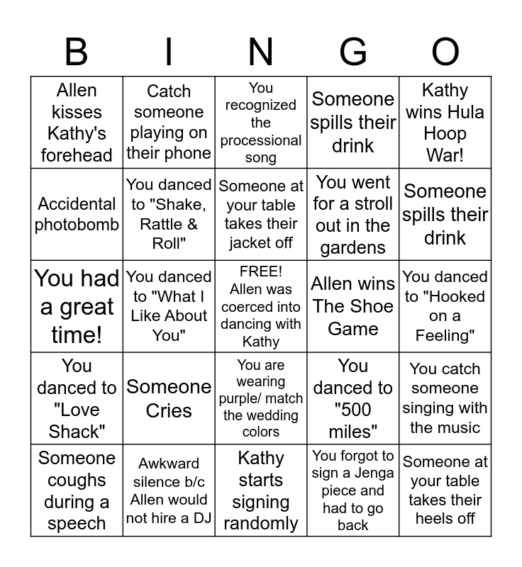 This bingo card has a free space and 24 words: Someone Cries, Awkward silence b/c Allen would not hire a DJ, Someone at your table takes their jacket off, Someone coughs during a speech, Kathy wins Hula Hoop War!, Allen kisses Kathy's forehead, Accidental photobomb, Catch someone playing on their phone, Allen wins The Shoe Game, You are wearing purple/ match the wedding colors, You went for a stroll out in the gardens, You had a great time!, You danced to "500 miles", You catch someone singing with the music, You danced to "Shake, Rattle & Roll", You forgot to sign a Jenga piece and had to go back, You danced to "Hooked on a Feeling", You recognized the processional song, Someone spills their drink, You danced to "What I Like About You", Someone at your table takes their heels off, You danced to "Love Shack", Someone spills their drink and Kathy starts signing randomly.