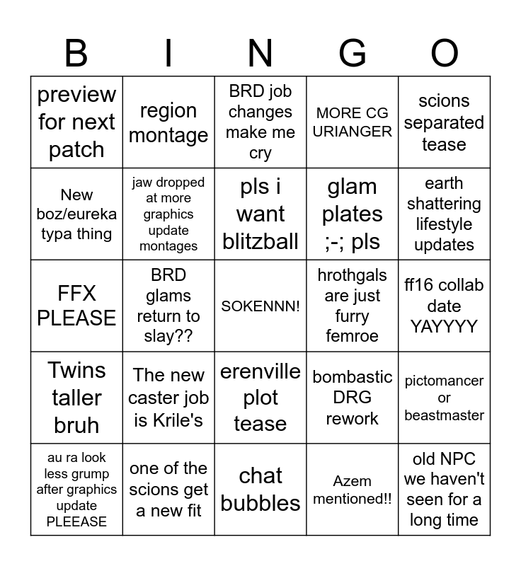 This bingo card has a free space and 24 words: The new caster job is Krile's, one of the scions get a new fit, pls i want blitzball, au ra look less grump after graphics update PLEEASE, scions separated tease, preview for next patch, New boz/eureka typa thing, region montage, hrothgals are just furry femroe, erenville plot tease, glam plates ;-; pls, FFX PLEASE, bombastic DRG rework, pictomancer or beastmaster, jaw dropped at more graphics update montages, Azem mentioned!!, ff16 collab date YAYYYY, BRD job changes make me cry, earth shattering lifestyle updates, BRD glams return to slay??, old NPC we haven't seen for a long time, Twins taller bruh, MORE CG URIANGER and chat bubbles.