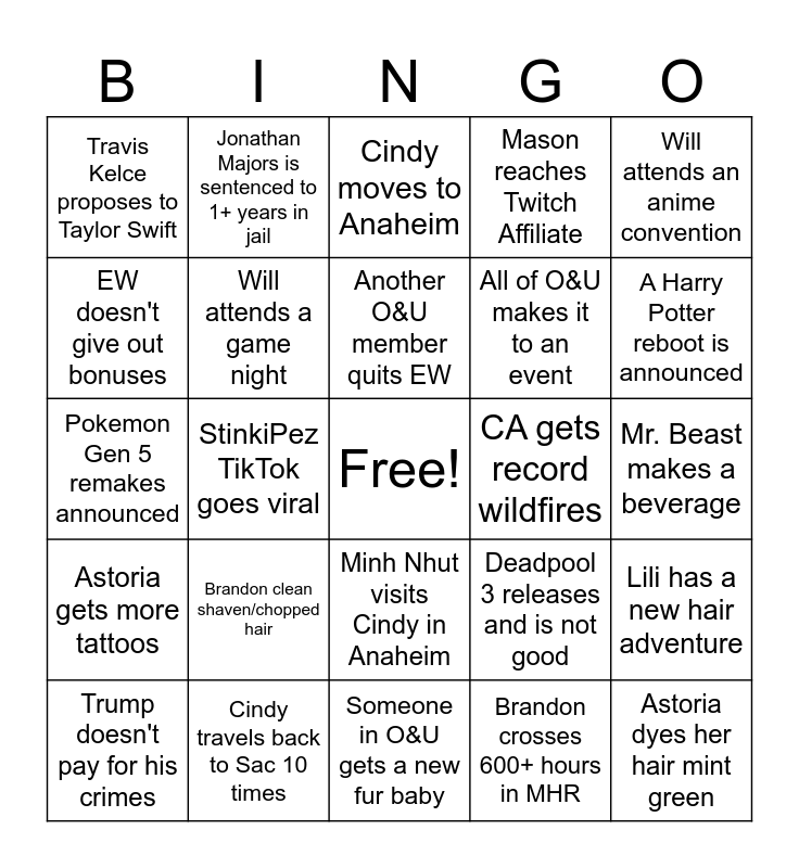 This bingo card has a free space and 24 words: Brandon clean shaven/chopped hair, Cindy travels back to Sac 10 times, Another O&U member quits EW, Trump doesn't pay for his crimes, Will attends an anime convention, Travis Kelce proposes to Taylor Swift, EW doesn't give out bonuses, Jonathan Majors is sentenced to 1+ years in jail, CA gets record wildfires, Minh Nhut visits Cindy in Anaheim, All of O&U makes it to an event, Pokemon Gen 5 remakes announced, Deadpool 3 releases and is not good, Lili has a new hair adventure, Will attends a game night, Brandon crosses 600+ hours in MHR, Mr. Beast makes a beverage, Cindy moves to Anaheim, A Harry Potter reboot is announced, StinkiPez TikTok goes viral, Astoria dyes her hair mint green, Astoria gets more tattoos, Mason reaches Twitch Affiliate and Someone in O&U gets a new fur baby.