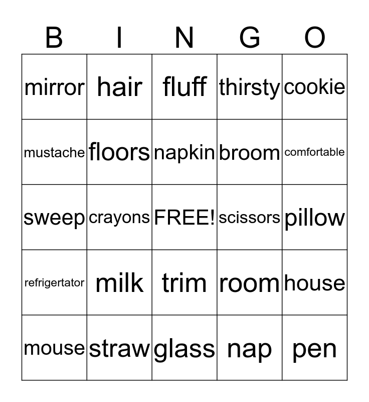 This bingo card has a free space and 24 words: milk, straw, napkin, mouse, cookie, mirror, mustache, hair, scissors, trim, broom, sweep, room, house, floors, nap, pillow, fluff, comfortable, crayons, pen, refrigertator, thirsty and glass.