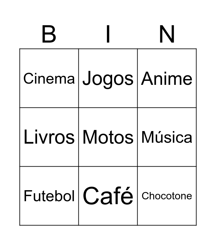 This bingo card has a free space and 8 words: Música, Anime, Jogos, Futebol, Cinema, Chocotone, Livros and Café.
