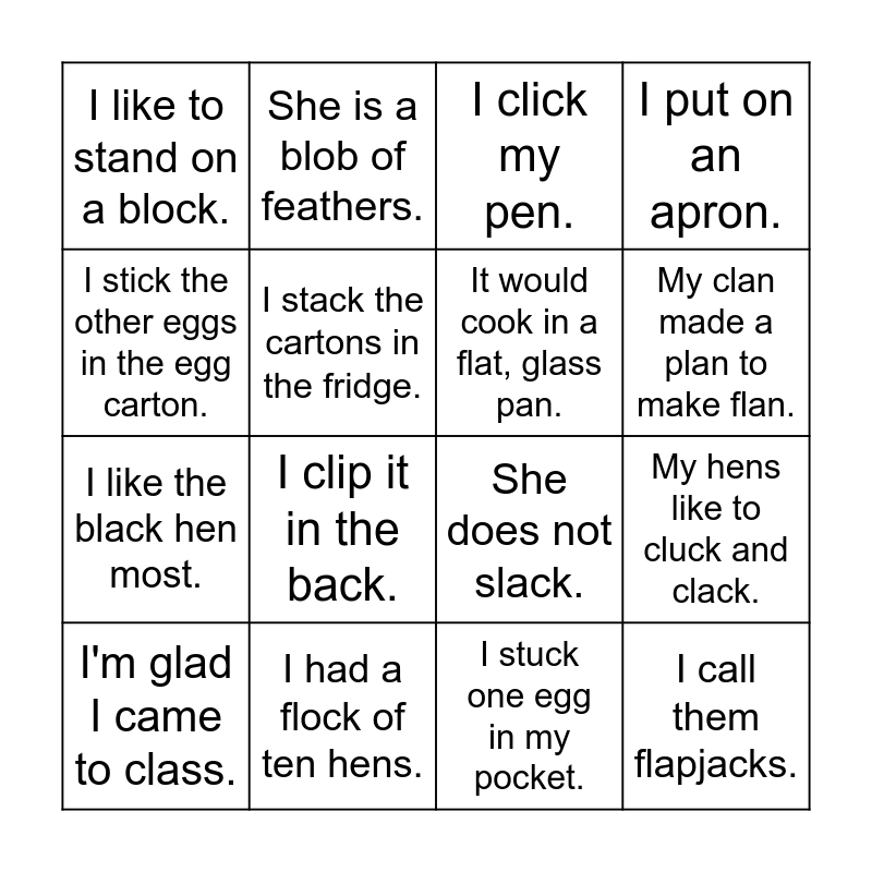 This bingo card has 16 words: I had a flock of ten hens., My hens like to cluck and clack., I click my pen., I like to stand on a block., I like the black hen most., She is a blob of feathers., She does not slack., I stuck one egg in my pocket., I stick the other eggs in the egg carton., I stack the cartons in the fridge., I'm glad I came to class., I put on an apron., I clip it in the back., My clan made a plan to make flan., It would cook in a flat, glass pan. and I call them flapjacks..