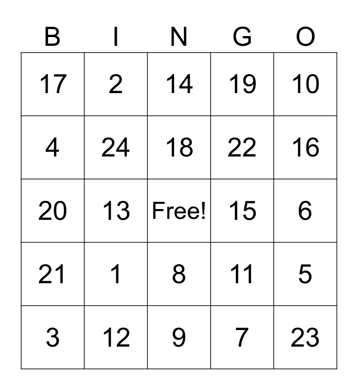 This bingo card has a free space and 24 words: 1, 12, 18, 3, 10, 17, 4, 2, 15, 8, 22, 20, 11, 5, 24, 7, 6, 14, 16, 13, 23, 21, 19 and 9.