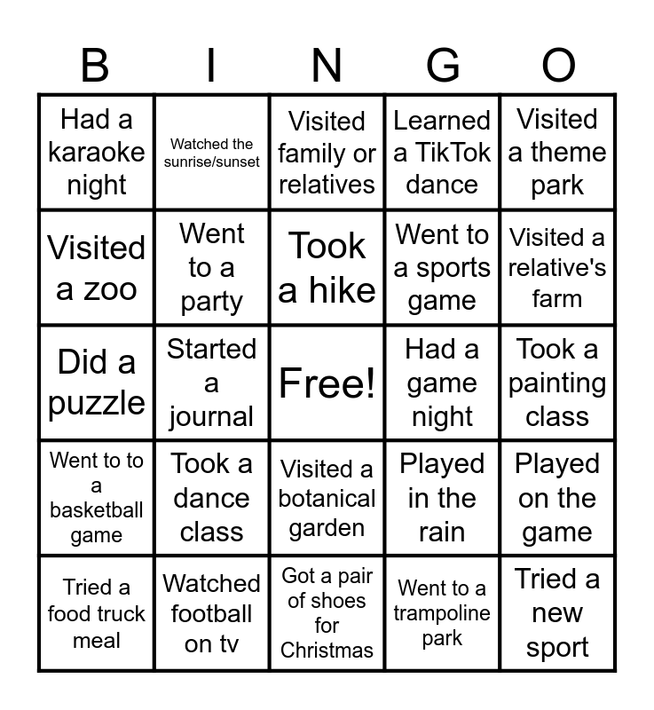 This bingo card has a free space and 77 words: Binge-watched a Netflix series, Built a snowman, Visited family or relatives, Tried a new recipe, Played in the snow, Went ice skating, Slept in past noon, Made hot cocoa, Did volunteer work, Tried sushi for the first time, Played a board game, Went to a museum, Took a hike, Visited a zoo, Had a movie marathon, Started a journal, Went to a concert, Tried a new sport, Took a road trip, Visited a theme park, Played video games, Did a puzzle, Went to a party, Watched the sunrise/sunset, Learned a TikTok dance, Went to the beach, Took a selfie with a pet, Had a picnic, Tried a new hairstyle, Read a book in a day, Went camping, Had a snowball fight, Made a DIY gift, Played in the rain, Visited a relative's farm, Went to a sports game, Had a bonfire, Tried a new restaurant, Took a painting class, Went to a trampoline park, Had a sleepover, Tried meditation or yoga, Visited an amusement arcade, Took a scenic drive, Visited a historical site, Went to a farmer's market, Tried a food truck meal, Had a karaoke night, Made a snow angel, Went to a comedy show, Tried an escape room, Visited a botanical garden, Did a random act of kindness, Had a BBQ, Went stargazing, Tried roller skating/blading, Visited a flea market, Made a homemade gift, Went to a petting zoo, Had a spa day at home, Took a dance class, Went to a book club, Tried pottery or ceramics, Visited a planetarium, Had a DIY photoshoot, Went thrift shopping, Tried a new language app, Had a game night, Visited an indoor playground, Tried a new ice cream flavor, Played in makeup, Played on the game, Went to to a basketball game, Watched football on tv, Went to a concert, Got a pair of shoes for Christmas and Went and saw the Xmas lights.