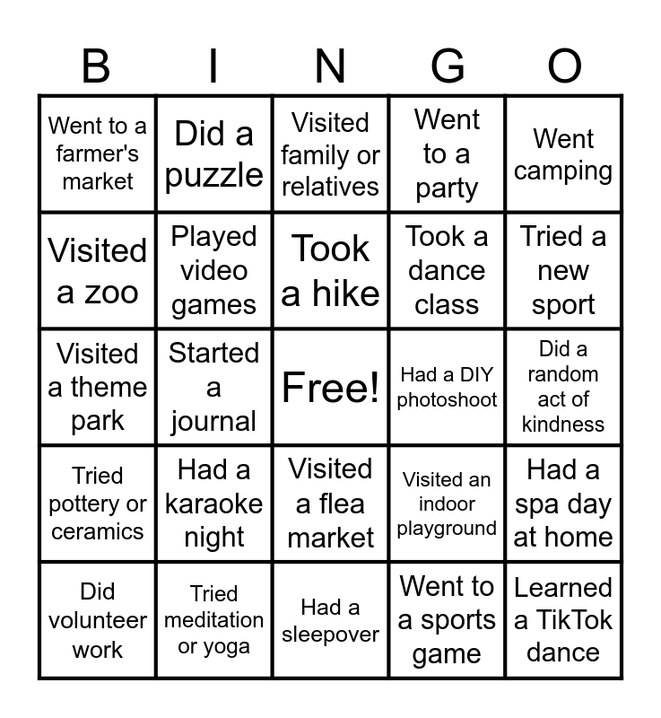 This bingo card has a free space and 74 words: Binge-watched a Netflix series, Built a snowman, Visited family or relatives, Tried a new recipe, Played in the snow, Went ice skating, Slept in past noon, Made hot cocoa, Did volunteer work, Tried sushi for the first time, Played a board game, Went to a museum, Took a hike, Visited a zoo, Had a movie marathon, Started a journal, Went to a concert, Tried a new sport, Took a road trip, Visited a theme park, Played video games, Did a puzzle, Went to a party, Watched the sunrise/sunset, Learned a TikTok dance, Went to the beach, Took a selfie with a pet, Had a picnic, Tried a new hairstyle, Read a book in a day, Went camping, Had a snowball fight, Made a DIY gift, Played in the rain, Visited a relative's farm, Went to a sports game, Had a bonfire, Tried a new restaurant, Took a painting class, Went to a trampoline park, Had a sleepover, Tried meditation or yoga, Visited an amusement arcade, Took a scenic drive, Visited a historical site, Went to a farmer's market, Tried a food truck meal, Had a karaoke night, Made a snow angel, Went to a comedy show, Tried an escape room, Visited a botanical garden, Did a random act of kindness, Had a BBQ, Went stargazing, Tried roller skating/blading, Visited a flea market, Made a homemade gift, Went to a petting zoo, Had a spa day at home, Took a dance class, Went to a book club, Tried pottery or ceramics, Visited a planetarium, Had a DIY photoshoot, Went thrift shopping, Tried a new language app, Had a game night, Visited an indoor playground, Took a nap, Went out of town, Caught a plane, Got some jewelry for Xmas and Tried a new ice cream flavor.