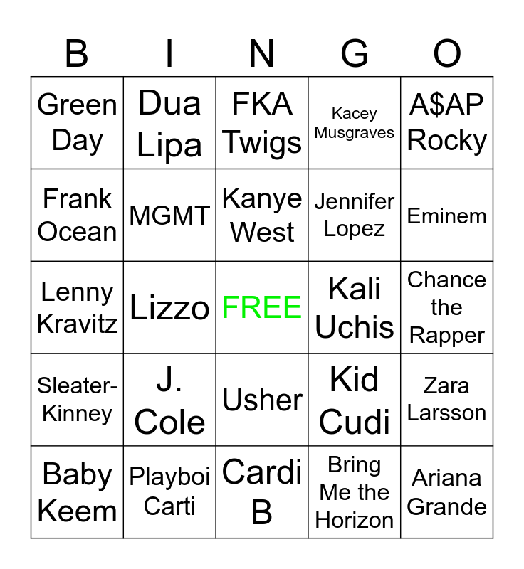 This bingo card has a free space and 24 words: J. Cole, Playboi Carti, Kanye West, Baby Keem, A$AP Rocky, Green Day, Frank Ocean, Dua Lipa, Kali Uchis, Usher, Jennifer Lopez, Lenny Kravitz, Kid Cudi, Zara Larsson, MGMT, Bring Me the Horizon, Chance the Rapper, FKA Twigs, Eminem, Lizzo, Ariana Grande, Sleater-Kinney, Kacey Musgraves and Cardi B.
