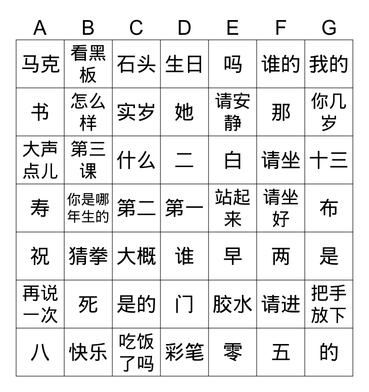 This bingo card has 142 words: 你好, 你, 好, 我, 是, 白, 大伟, 李, 兰兰, 再见, 同学, 们, 同学们, 林, 老师, 他, 早, 你们, 明天, 见, 请进, 请坐, 站起来, 不要说话, 注意听, 请安静, 看黑板, 把书打开, 到前面来, 请回座位, 请坐好, 请举手, 把手放下, 大声点儿, 再说一次, 很好, 非常好, 你忙吗, 怎么样, 上哪儿去, 吃饭了吗, 一, 二, 三, 四, 五, 六, 七, 八, 九, 十, 零, 十三, 二十, 四十五, 加, 等于, 减, 乘以, 除以, 第一, 第二, 第三, 第一课, 第二课, 第三课, 双喜, 五福临门, 六六大顺, 死, 谁, 马克, 她, 啊, 欢迎, 请进, 谢谢, 祝, 生日, 快乐, 今年, 几, 岁, 两, 实岁, 虚岁, 你几岁, 你多大, 你是哪年生的, 你属什么, 您多大年纪, 您高寿?, 您, 寿, 寿桃, 寿面, 猪脚面线, 万寿无疆, 人, 山, 谁的, 尺, 剪刀, 笔, 书, 毛笔, 书包, 橡皮, 这, 什么, 不, 知道, 吗, 那, 的, 我的, 大概, 你的, 不是, 小明, 是的, 不客气, 教室, 门, 窗户, 黑板, 黑板擦, 粉笔, 桌子, 椅子, 铅笔, 铅笔盒, 圆珠笔, 胶水, 彩笔, 纸, 猜拳, 石头, 布, 书法, 墨 and 砚台.