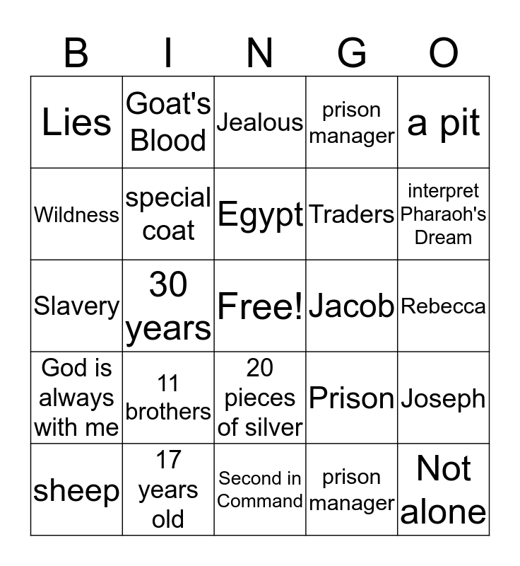 This bingo card has a free space and 24 words: 11 brothers, 17 years old, Egypt, sheep, a pit, Lies, Wildness, Goat's Blood, Jacob, 20 pieces of silver, Traders, Slavery, Prison, Joseph, special coat, prison manager, Rebecca, Jealous, interpret Pharaoh's Dream, 30 years, Not alone, God is always with me, prison manager and Second in Command.