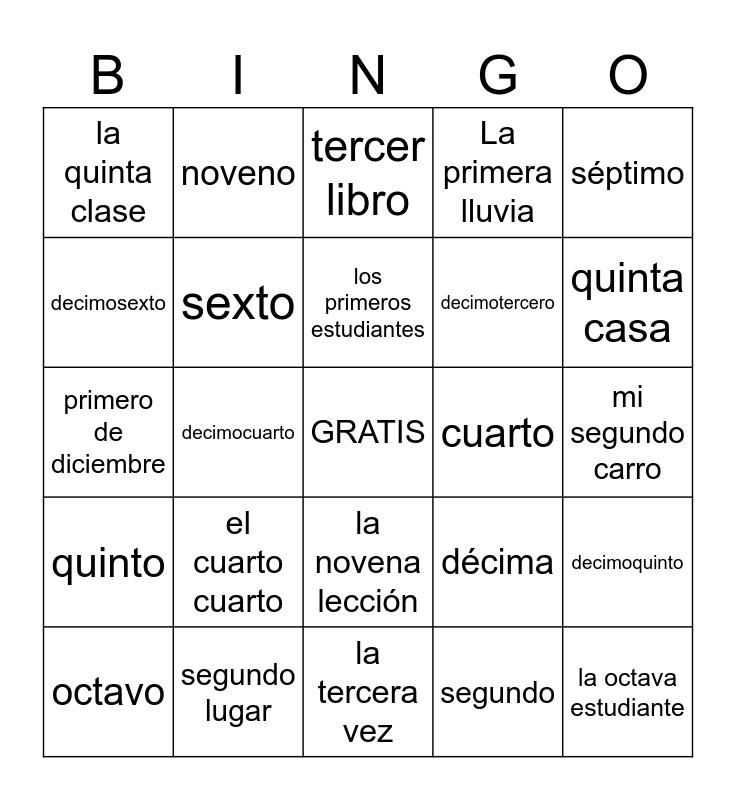 This bingo card has a free space and 34 words: primero de enero, segundo, tercero, cuarto, quinto, sexto, séptimo, octavo, noveno, décimo, los primeros estudiantes, tercer libro, primero, primer, cuarto, quinta casa, segundo lugar, primero de diciembre, el cuarto cuarto, décima, la novena lección, la primera dama, la quinta clase, mi segundo carro, la tercera vez, la octava estudiante, La primera lluvia, Rey Carlos Tercero, decimotercero, decimosexto, decimonoveno, decimocuarto, decimoquinto and decimooctavo.