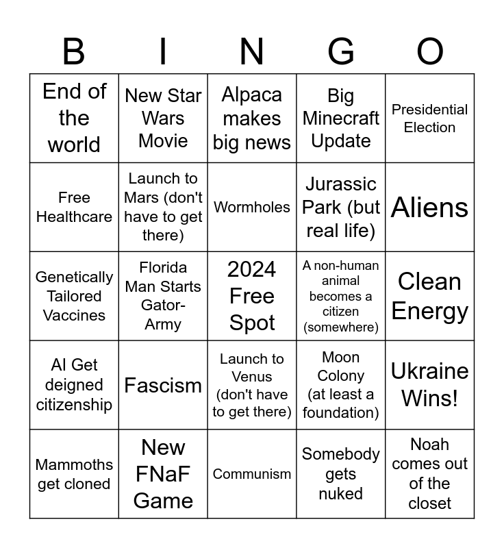 This bingo card has a free space and 24 words: Fascism, New FNaF Game, Wormholes, Mammoths get cloned, Presidential Election, End of the world, Free Healthcare, New Star Wars Movie, A non-human animal becomes a citizen (somewhere), Launch to Venus (don't have to get there), Jurassic Park (but real life), Genetically Tailored Vaccines, Moon Colony (at least a foundation), Ukraine Wins!, Launch to Mars (don't have to get there), Somebody gets nuked, Clean Energy, Alpaca makes big news, Aliens, Florida Man Starts Gator-Army, Noah comes out of the closet, AI Get deigned citizenship, Big Minecraft Update and Communism.