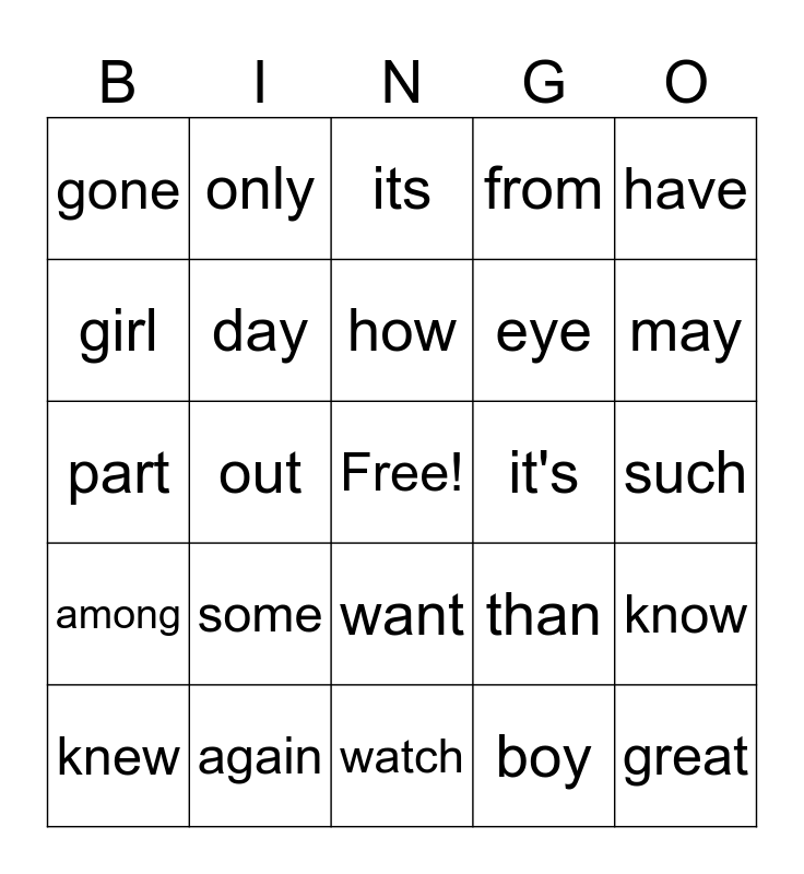 This bingo card has a free space and 60 words: about, again, also, among, boy, call, day, every, eye, first, from, full, girl, give, goes, gone, great, have, here, how, it's, its, knew, know, live, look, love, many, may, most, much, new, often, oh, only, other, our, out, own, part, see, some, such, take, than, they, too, two, very, want, watch, way, we, were, what, where, which, who, whose and why.