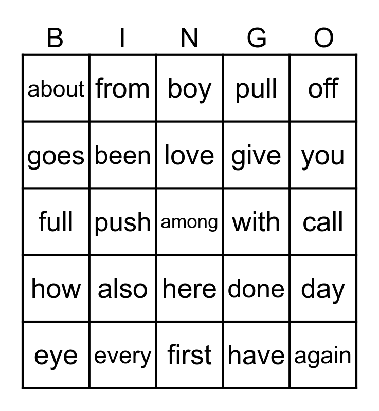 This bingo card has 36 words: Free!, all, any, been, done, how, love, of, off, one, push, pull, says, with, you, about, again, also, among, boy, call, day, every, eye, first, from, full, girl, give, goes, gone, great, have, here, how and know.