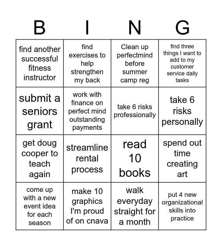 This bingo card has 16 words: make 10 graphics I'm proud of on cnava, spend out time creating art, Clean up perfectmind before summer camp reg, find another successful fitness instructor, get doug cooper to teach again, find exercises to help strengthen my back, read 10 books, walk everyday straight for a month, submit a seniors grant, work with finance on perfect mind outstanding payments, come up with a new event idea for each season, find three things I want to add to my customer service daily tasks, streamline rental process, take 6 risks personally, take 6 risks professionally and put 4 new organizational skills into practice.