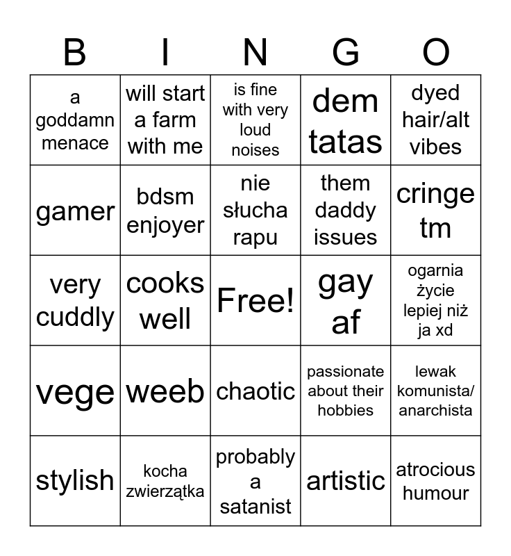 This bingo card has a free space and 24 words: weeb, kocha zwierzątka, nie słucha rapu, stylish, dyed hair/alt vibes, a goddamn menace, gamer, will start a farm with me, gay af, chaotic, them daddy issues, very cuddly, passionate about their hobbies, lewak komunista/ anarchista, bdsm enjoyer, artistic, ogarnia życie lepiej niż ja xd, is fine with very loud noises, cringe tm, cooks well, atrocious humour, vege, dem tatas and probably a satanist.