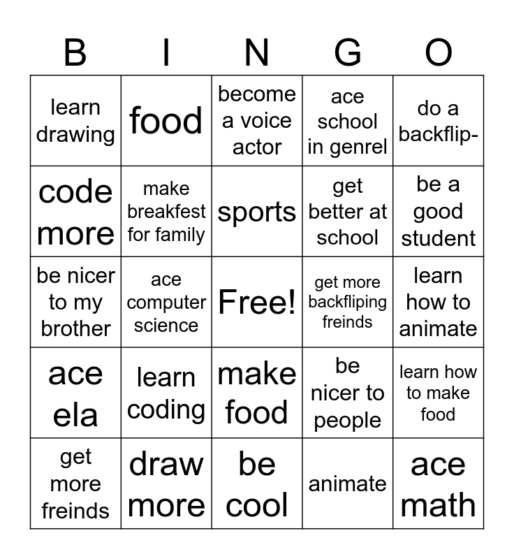 This bingo card has a free space and 24 words: learn coding, draw more, sports, get more freinds, do a backflip-, learn drawing, code more, food, get more backfliping freinds, make food, get better at school, be nicer to my brother, be nicer to people, learn how to make food, make breakfest for family, animate, learn how to animate, become a voice actor, be a good student, ace computer science, ace math, ace ela, ace school in genrel and be cool.