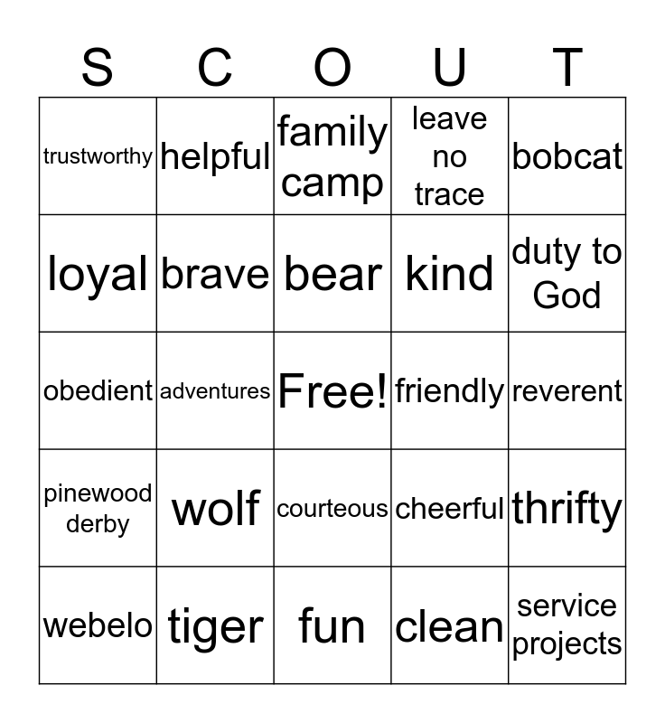This bingo card has a free space and 24 words: wolf, tiger, bear, webelo, bobcat, trustworthy, loyal, helpful, friendly, courteous, kind, obedient, cheerful, thrifty, brave, clean, reverent, family camp, duty to God, adventures, service projects, pinewood derby, leave no trace and fun.