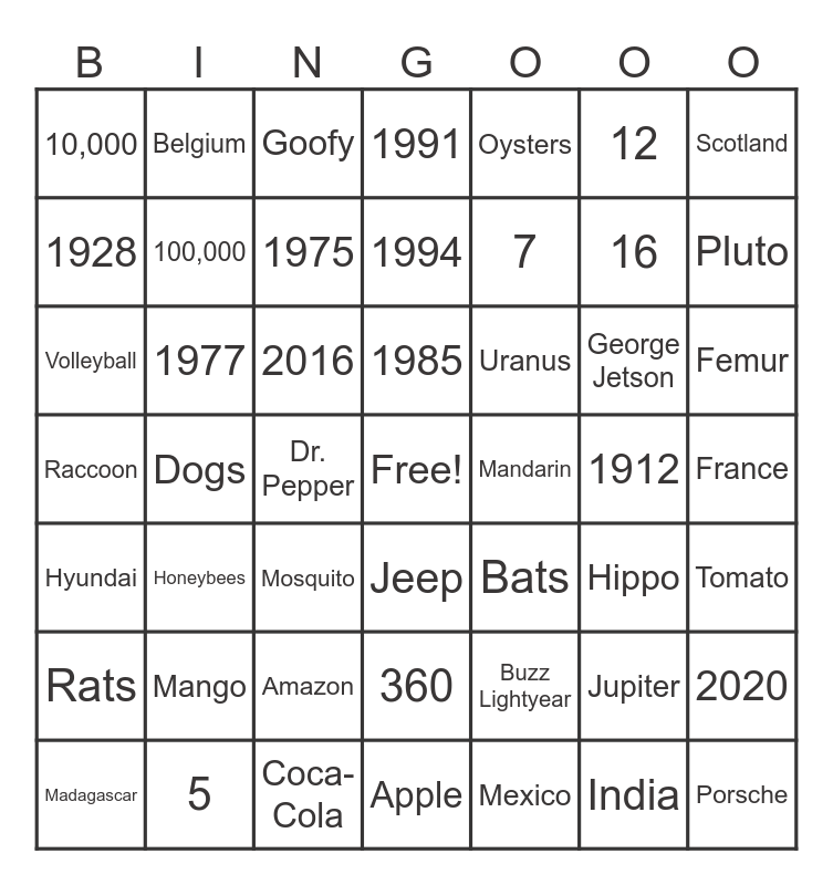 This bingo card has a free space and 48 words: Buzz Lightyear, 16, Apple, Dogs, 2016, France, Belgium, 5, 12, Jeep, Scotland, 1991, George Jetson, Uranus, Rats, 1912, 1928, Pluto, Jupiter, Oysters, 7, Dr. Pepper, 10,000, 100,000, 2020, 1975, Femur, Madagascar, 1985, 1977, India, Mandarin, Tomato, Mango, Raccoon, Bats, Hippo, Volleyball, Mosquito, Amazon, Hyundai, Porsche, Goofy, Coca-Cola, 1994, 360, Honeybees and Mexico.