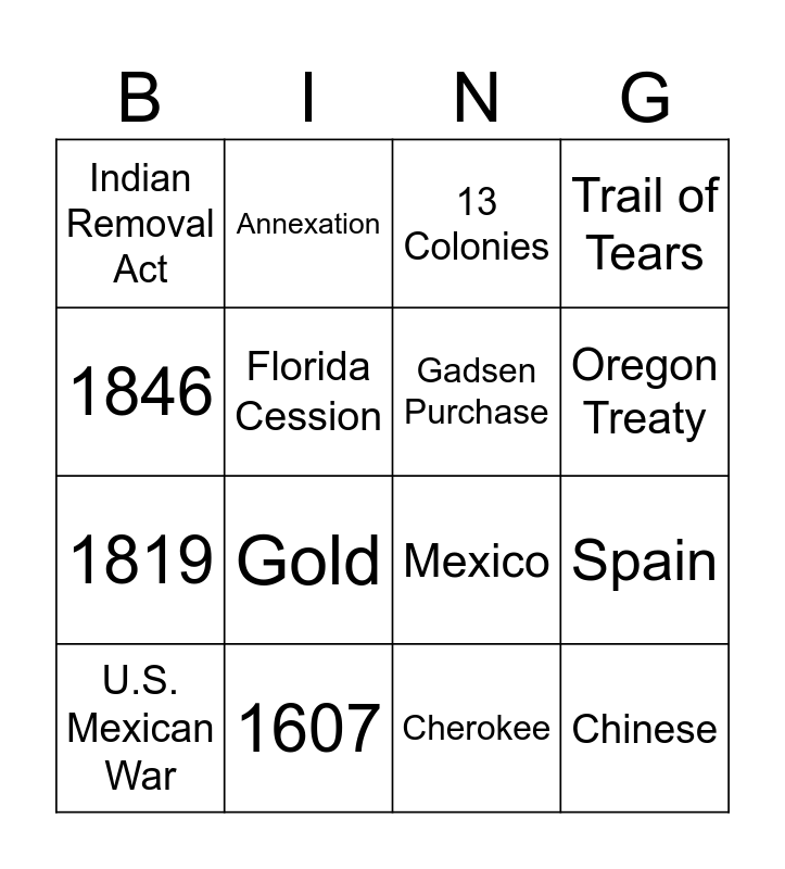 This bingo card has 16 words: 1607, Spain, 13 Colonies, Indian Removal Act, 1819, Annexation, Mexico, Cherokee, 1846, Florida Cession, U.S. Mexican War, Trail of Tears, Gold, Oregon Treaty, Gadsen Purchase and Chinese.