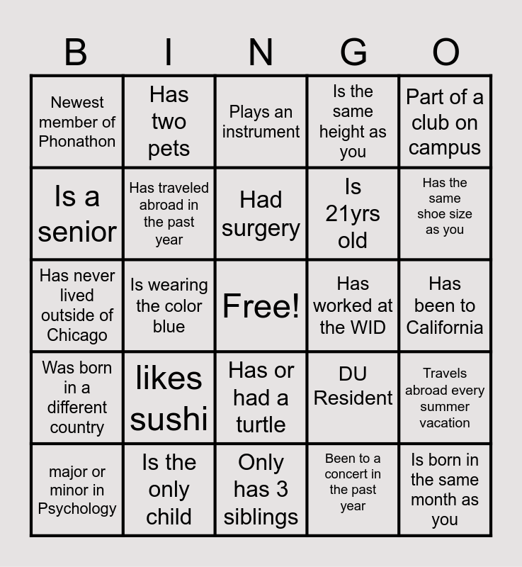 This bingo card has a free space and 25 words: likes sushi, Only has 3 siblings, Had surgery, major or minor in Psychology, Part of a club on campus, Newest member of Phonathon, Is a senior, Has two pets, Has worked at the WID, Has or had a turtle, Is 21yrs old, Has never lived outside of Chicago, DU Resident, Travels abroad every summer vacation, Has traveled abroad in the past year, Is a sophomore, Has been to California, Plays an instrument, Has the same shoe size as you, Is wearing the color blue, Is born in the same month as you, Is the only child, Was born in a different country, Is the same height as you and Been to a concert in the past year.