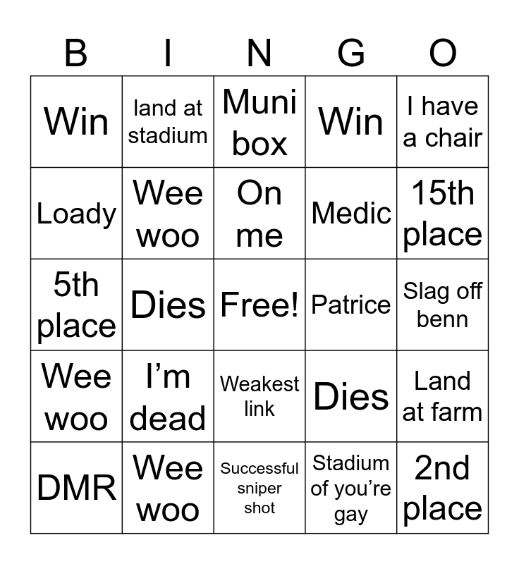 This bingo card has a free space and 24 words: I’m dead, Wee woo, On me, DMR, I have a chair, Win, Loady, land at stadium, Patrice, Weakest link, Medic, 5th place, Dies, Land at farm, Wee woo, Stadium of you’re gay, Slag off benn, Muni box, 15th place, Dies, 2nd place, Wee woo, Win and Successful sniper shot.