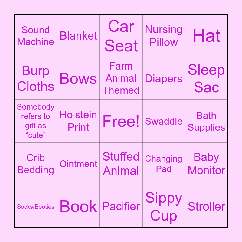 This bingo card has a free space and 36 words: Anything Pink, Basket, Bibs, Bows, Changing Pad, Crib Bedding, Farm Animal Themed, Handmade Item, Hat, Highchair, Holstein Print, Nursing Pillow, Onesie, Swaddle, Sleep Sac, Sound Machine, Wipes, Ointment, Stroller, Car Seat, Bath Supplies, Baby Monitor, Book, Socks/Booties, Pacifier, Blanket, Somebody refers to gift as “cute”, Towel, Diapers, Burp Cloths, Bottles, Diaper Bag, Sippy Cup, Stuffed Animal, Teether and Toy.